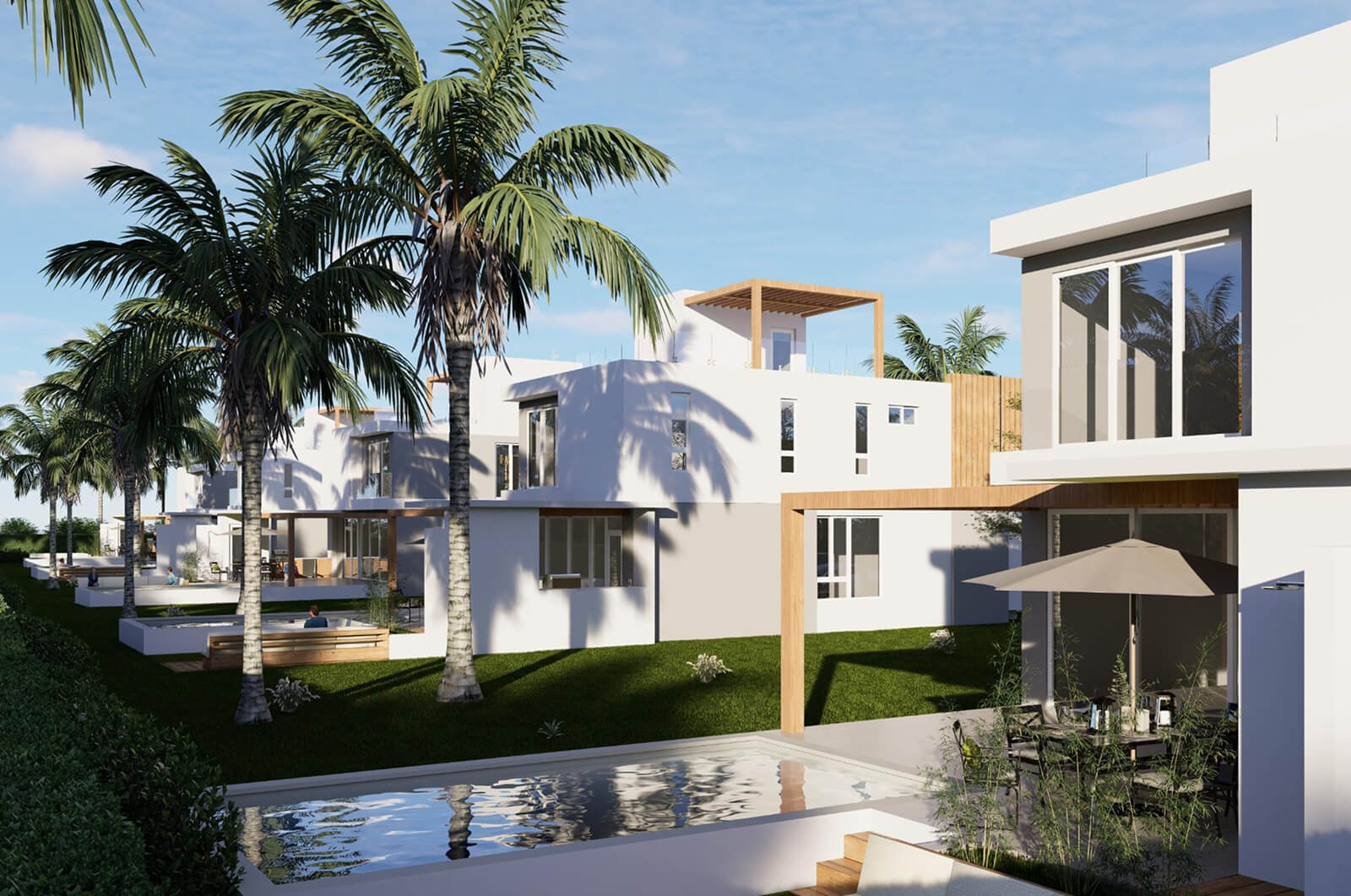 The architectural approach mirrors the successful Beachwalk Villas concept — clean lines, low-maintenance finishes, and functional luxury designed to perform equally well as a private residence or a rental investment. Expansive glazing frames panoramic twilights, while outdoor living areas maximize airflow and island breezes.