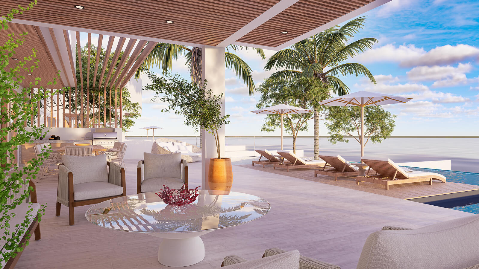 The main residence features four bedrooms and four-and-a-half baths, designed around open-concept living spaces where natural light, glass walls, and uninterrupted water views define the atmosphere. The chef-inspired kitchen anchors the entertaining area, flowing seamlessly into expansive living and dining spaces that open directly onto the glass-fronted infinity pool terrace.